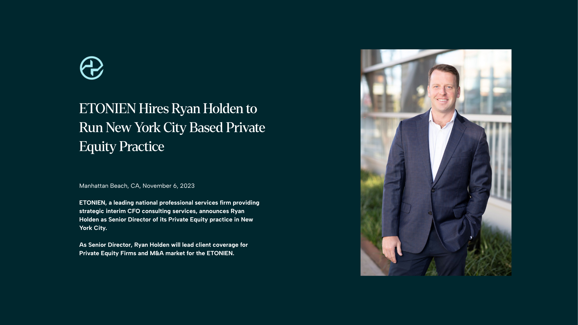 ETONIEN, a leading national professional services firm providing strategic interim consulting and transformation services, announces the appointment of Ryan Holden as Senior Director of the Company’s Financial Transformation Practice.